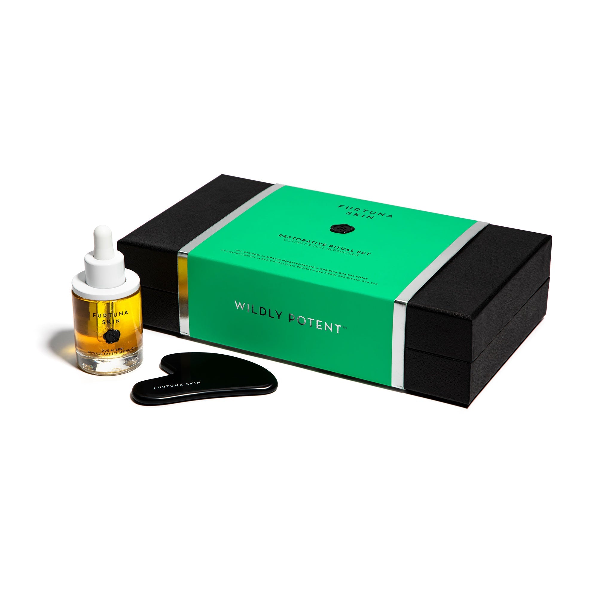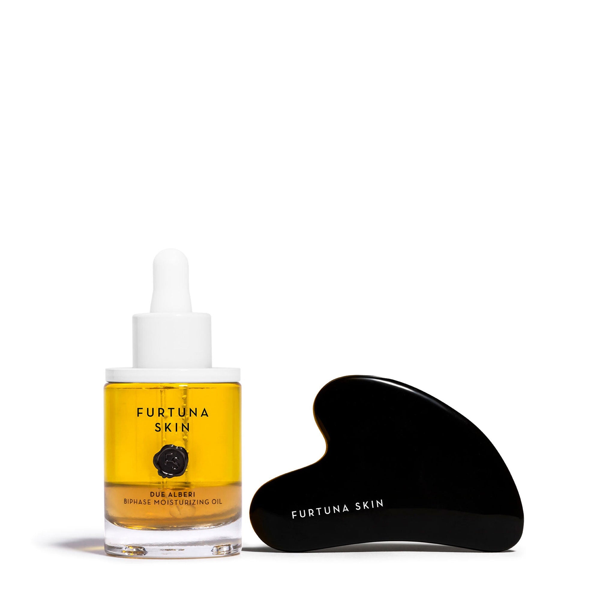 Pair Furtuna Skin’s Biphase Moisturizing Oil with their Obsidian Gua Sha stone for a restorative self-care ritual that imparts a rejuvenated, luminous glow to the skin while reducing the appearance of puffiness. This oil combines botanically infused olive oil and nutrient-rich olive leaf water to support skin’s natural collagen and elastin. For added benefits, employ the Obsidian Gua Sha Stone to improve the look of facial contours, relax mind and muscles, boost circulation, and encourage lymphatic drainage.SET INCLUDES: 1 Biphase Moisturizing Oil& 1 Obsidian Gua Sha Stone